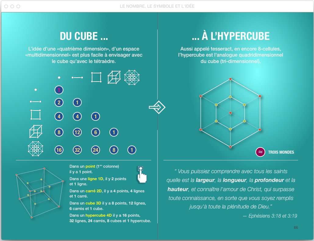Un cube sur 3 : 1, 8, 27, 64, ... ainsi qu’un hypercube sur 3 : 1, 9, 36, 100, ... appartiennent également aux Attributs Divins (valeur secrète égale à 1) et occupent le lieu dédié au Temps, à la Lumière visible du Soleil.